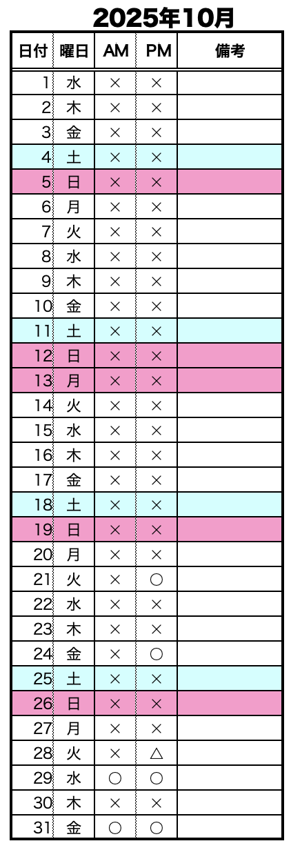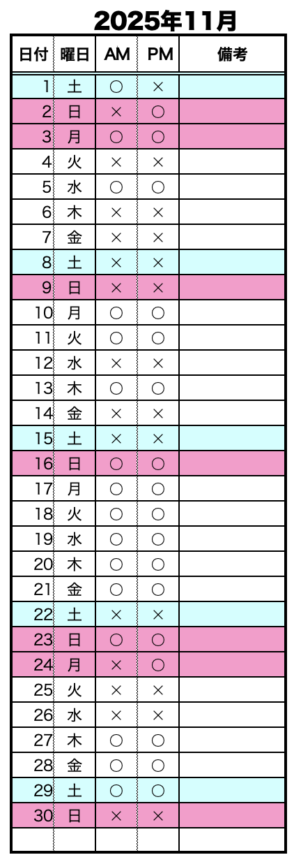 ※備考欄の『8:30空』などの意味は、『手洗い洗車』や『撥水手洗い洗車』、『1ヶ月コーティング』であれば、AM枠で8:30入庫なら施行可能という意味となります。