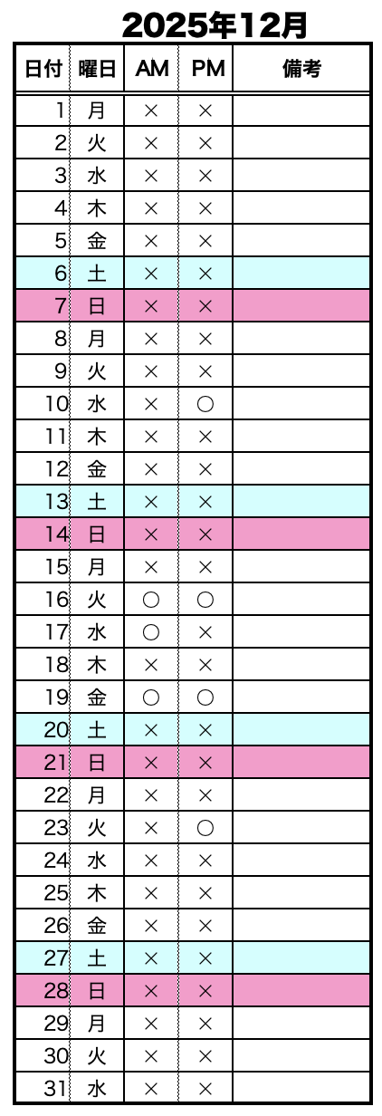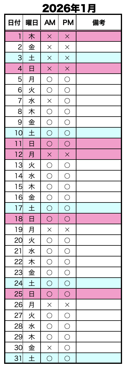 ※○印であっても、時間差で埋まっていたり、『手洗い洗車』などの軽微な施行が入っている場合があります。